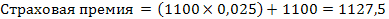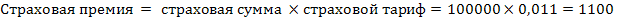 Пример 9. Страхователь заключил договору временно возобновляемого страхования на случай смерти. Страховая сумма 100000 д.е., возобновление происходит ежегодно, страховой тариф в первый год — 1,1 % страховой суммы. В каждый момент возобновления страховая премия увеличивается на 2,5 %. Рассчитать страховую премию за третий.
