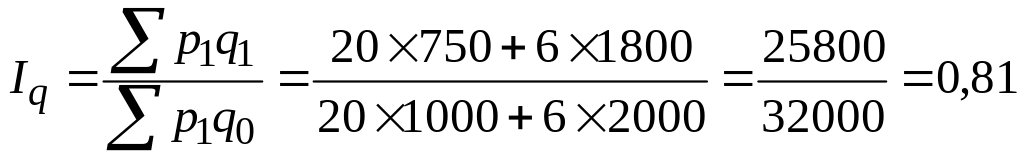 (количество проданных товаров по двум видам в среднем снизилось на 19 %).