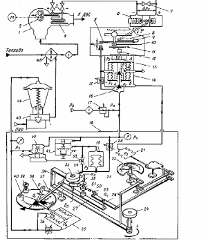 Объектом регулирования является участок топливной магистрали с паровым топливо подогревателем 45, пар к которому подводится через клапан 43. В качестве датчика применена капиллярная трубка 4 значительной длины, через которую топливо из магистрали прокачивается шестеренчатым насосом 2 постоянной подачи, приводимым в действие электродвигателем. Насос и капилляр смонтированы в специальном угловом парубке 1, установленном на нагнетательном топливном трубопроводе идущим к двигателю. Выходным сигналом является перепад давлений на участке капилляра. Этот сигнал поступает на вход дифференциального сильфонного датчика 6. Разность сил действующая на торцы сильфонов от перепадов давлений топлива, уравновешивается силой действия цилиндрической пружины. При установившемся режиме шток сильфонов неподвижен и через соединительный валик, рычаг 8, пластинчатую пружину 9 удерживает на ролике 10 заслонку 5 относительно сопла с зазором. Так как датчик может быть установлен на значительном расстоянии от пульта 18 управления, то в него введен двухкаскадный усилитель мощности 14. Сжатый воздух от стабилизатора 17 под давлением подается к двухседельному клапану 16 и к дросселю 15 делителя давления. Давление за дросселем и в меж сильфонной камере определяется проходным сечением дросселя и расходом воздуха в атмосферу через сопло. Давление на кольцевой торец нижних сильфонов уравновешивается силой жесткости всех сильфонов и двухседельный клапан 16 удерживается в закрытом положении, что соответствует определенному значению выходного давления в камере. Это же давление действует на мембрану жесткой обратной связи 13, сила которой уравновешивается действием пружины на ее жесткий центр, удерживая через талрепный шток 12, поперечину 11 и опорный ролик 10 заслонку 5 в положении, наращивания давления. Сигнал пропорциональной вязкости топлива, поступает в полость сильфонного датчика 21 изодромного ПИ – преобразователя, смонтированного в пульте 18. Сжатый воздух подается к пульту под давлением от того же стабилизатора 17, поступая к дросселю делителя давления 20, задатчику дистанционного управления 41 и усилителю мощности 42.Давление воздуха на торце сильфона 21 уравновешивается силой от его жесткости. Торец сильфона системой тяг и рычагов связан с приводом оси стрелки 22 указателя истинной вязкости топлива и с рычагом 28. Рычаг через палец 29, пружину с петлей 30 и ось 31 удерживает угловую заслонку 32 относительно сопла 34 в определенном положении. Открытие дросселя 20 определяет давление в магистрали перед соплом и под мембранной датчика усилителя 42. Выходной сигнал усилителя в виде давления поступает в полость мембранного исполнительного механизма 44 и к сильфонному блоку 25 изодромной обратной связи. При установившемся режиме давления в полостях блока 25 выравниваются через дроссель 26, а торец сильфона неподвижен и удерживает через выходной шток тягу 37 и рычаг 27 в определенном положении. Все силы в звеньях регулятора уравновешены и удерживают их в неподвижном состоянии. Количество теплоты подводимого с греющим паром к топливу и отводимым им, в подогревателе равно,а температура и вязкость топлива неизменны. С увеличением расхода топлива тепловой баланс в подогревателе топлива нарушается, возрастают вязкость топлива и перепад давлений. Нарушается равнов
