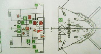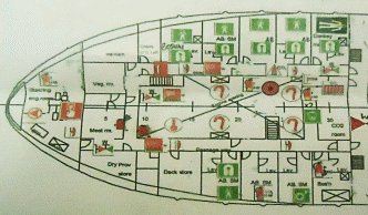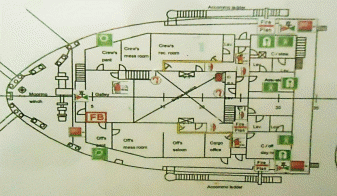 На судне имеются, 22 защитных костюма, они находятся у каждого члена экипажа в каюте, в ЦПУ и на мостике для вахты. На судне имеются 22 спасательных жилета, они находятся у каждого члена экипажа в каюте, в ЦПУ и на мостике для вахтенной службы. На судне имеются две открытые спасательные шлюпки на 39 человек, они находятся на шлюпочной палубе по бортам судна. На судне имеются два сбрасываемых спасательных плота на 16 человек они находятся на шлюпочной палубе рядом со шлюпками. На судне есть 20 термокостюмов, они находятся в шлюпках, и в ящиках на месте сбора экипажа при тревоге. На судне есть два спасательных круга с дымовой шашкой и сигнальным огнем они находятся на крыльях мостика. Так же на судне имеются три спасательных круга с сигнальным огнем они находятся, один на главной палубе на правом бору и два других на шлюпочной палубе на корме. На судне имеются два спасательных круга с линем по 18 м, они находятся на спардечной палубе в корме. На судне есть два простых спасательных круга без дополнительного оборудования, они находятся на палубе бака. На судне есть один радиомаяк EPIRB , он находится на мостике. На судне есть два буя радара SART, они находятся на капитанском мостике. Три переносных рации, они так же находятся на мостике. Четыре линемёта они то же находятся на мостике судна. 24 парашютные ракеты они находятся в шлюпках и на мостике судна. 12 фальшфейеров они то же находятся в шлюпках и на ходовом мостике. 2 штормовых трапа они находятся на шлюпочной палубе около шлюпок. 9 дыхательных аппаратов, они находятся в машинном отделении и на жилых палубах. На судне имеется большая медицинская аптечка, она находится в госпитале.