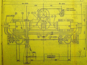 На судне установлена электро-гидравлическая рулевая машина RW- 170A Японской фирмы Кавасаки. Она состоит из 1 Румпеля; 2 Шпонки; 3 Ползуна; 4 Палец ползуна; 5 Кронштейнов; 6 Гидравлических цилиндров; 7 Поворотного рычага; 8 Трубопровода; 9 Двух электромоторов; 10 Датчик трансмиттера; 11 Автопилота( телемора)