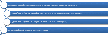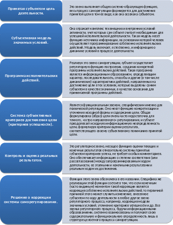 Анализируя способы построения концептуальной модели процесса осознанной саморегуляции, О. А. Конопкин пришел к выводу, что наиболее адекватным является системно-функциональный подход к анализу структуры регуляторных процессов. Это означает, что процесс саморегуляции должен быть отражен как целостная, информационно открытая система, реализуемая взаимодействием функциональных звеньев, основанием для выделения которых являются присущие им специфические регуляторные функции, системное «сотрудничество» которых реализует целостный процесс регуляции, обеспечивающий достижение принятой субъектом цели.53 Таким образом, функциональные звенья и реализуют структурно полноценный процесс саморегуляции.