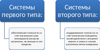 Согласно представлениям П. К. Анохина функциональная система имеет разветвленный морфофизиологический аппарат, обеспечивающий за счет присущих ей закономерностей как эффект гомеостаза, так и саморегуляции. П. К. Анохин выделял два типа функциональных систем:67