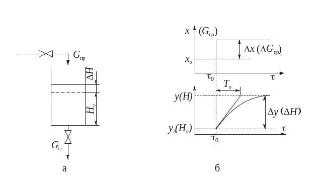 Рис. 1.2. Приклад об’єкта з самовирівнюванням (а) та його крива розгону (б).