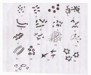 Рисунок 3. 1 – мікрокок; 2 – диплокок; 3 – сарцина; 4 – стафілокок; 5 – стрептокок; 6 – паличка; 7 – вібріон; 8 – спірила; 9 – спірохета; 10 – коринеформна4 11 – актиноміцет; 12 – стебельцева; 13 – нитчаста; 14 – тороїд; 15 – простекобактерія; 16 – зірчаста простекобактерія; 17 – плоскі бактерії.