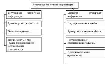 Вторичные данные - информация, собранная когда-либо для каких-либо целей, не связанных с текущей задачей. Это те данные, которые уже были собраны (Вами или кем-то другим) для решения других задач, но которые можно частично использовать и для разрешения стоящей перед Вами в настоящий момент проблемы. Источники внутрифирменной информации показаны на рисунке 13.5. Методы анализа вторичной информации представлены в таблице 13.2. Сбор и обработку вторичной информации называют кабинетным исследованием.