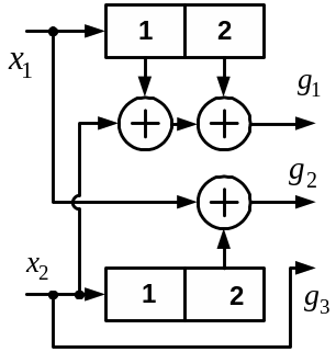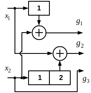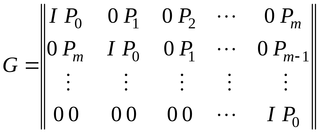 Сверточный код требует для своего описания нескольких порождающих многочленов – в общем случае . Порождающие многочлены могут быть объединены в порождающую матрицу :