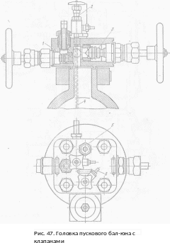 Балони високого тиску з внутрішнім діаметром більше 150 мм мають горловини для огляду внутрішньої поверхні і очищення їх від бруду н масла парою або содовим розчином. На довгих балонах (більше 2,5 м) горловини для очищення та огляду встановлюють з обох кінців. Зверху горловина закрита головкою, до якої кріпиться арматура (рис. 47): прийомний клапан 1; клапан продування 2 і трубка 4; клапан 3, повідомляє балон з пускової магістраллю; запобіжний клапан 5; трубка 6 до манометру.
