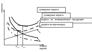 С увеличением числа деталей в партии общие затраты на переналадку снижаются, но при этом увеличиваются затраты на хранение деталей, которые не сразу идут в дальнейшую работу, например, на сборку, а создают незавершенное производство.