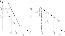 1.Неэластичный спрос (EP(D) < -1) – изменение цены на 1 % вызывает незначительное изменение объема (QD) (рис 1.а).