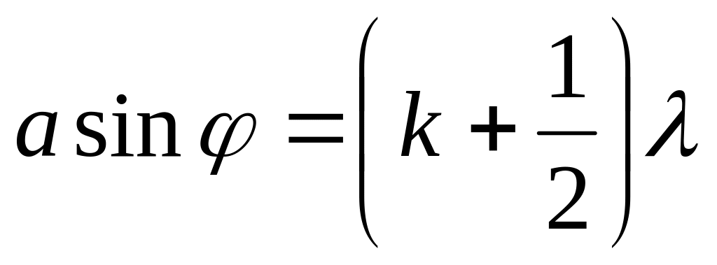 Дифракція Фраунгофера спостерігається на плоскій щілині, ширина якої a. Умова дифракційного максимуму має вигляд: