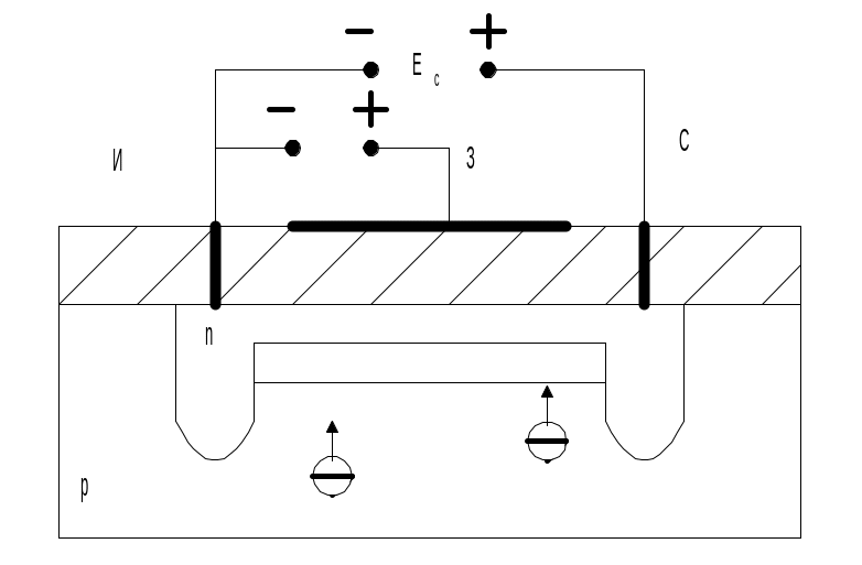 Если напряжение на стоке Ес>0, то во внешней цепи будет протекать ток стока Iс>0, величина которого зависит от концентрации носителей и геометрических размеров. Это при условии, что напряжение на затворе Uз=0.