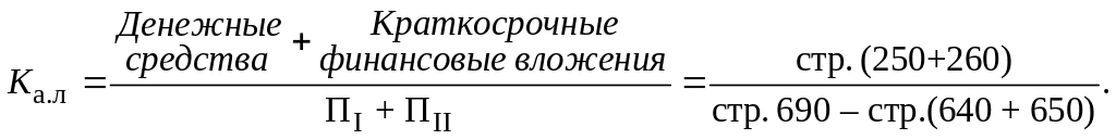 Коэффициент абсолютной ликвидности (Ка.л) показывает, какую часть краткосрочной задолженности организация может погасить в ближайшее время:
