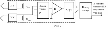 Рассмотрим задачу об измерении температуры нескольких удалённых объектов. Пусть в качестве датчиков температуры используются термопары. Термопары выдают непрерывные аналоговые сигналы в виде напряжения, которое растёт при увеличении температуры. Напряжение термопар находится в диапазоне нескольких милливольт. Возможная функциональная схема для измерения температур нескольких объектов представлена на рис. 7. Напряжение с концов термопары поступает на нормирующий усилитель. Поскольку нормирующий усилитель удалён от основной части измерительной системы, и расстояние от каждого нормирующего усилителя до основной части измерительной системы различно, то используется преобразование напряжения в ток. Величина тока при этом пропорциональна температуре. Это делается для уменьшения погрешности измерения, вносимой сопротивлением проводов различной длины от нормирующих усилителей до коммутатора сигналов. У входа коммутатора токи преобразуется в напряжения на резисторах Rизм. Коммутатор по команде микроконтроллера подключает к измерительному каналу напряжение от каждого Rизм. То есть поочерёдно будет измеряться сигнал от каждой термопары. Поскольку входное сопротивление микросхемы АЦП, соизмеримо с сопротивлением открытого ключа коммутатора, то между выходом коммутатора и входом АЦП устанавливается повторитель напряжения. Дело в том, что повторитель обладает намного большим входным сопротивлением, чем микросхема АЦП. Включение в измерительный тракт повторителя уменьшает погрешность измерения, связанную с конечным сопротивлением ключа коммутатора, на котором в отсутствие повторителя падала бы заметная часть напряжения сигнала. С выхода АЦП данные в параллельном коде поступают на вход микроконтроллера, который в данной схеме является операционным блоком.