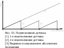 Для однооборотных датчиков информация об абсолютном положении всегда относится только к одному обороту. Многооборотный датчик с помощью последовательно соединенных через понижающий редуктор кодирующих дисков способен регистрировать еще и количество выполненных оборотов (до 4096) относительно абсолютной 0-позиции. После 4096 оборотов происходит переполнение датчика (рис.55), которое все же учитывается в постоянной памяти контроллера. Сохраняется до 256 переполнений датчика. Если на контактах питания напряжение падает ниже предельного значения (например, при отказе сети), постоянная статическая память это распознает и сохраняет данные.