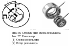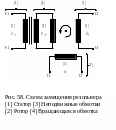 Резольвер работает по принципу вращающегося трансформатора и состоит из 2 функциональных узлов – ротора с обмоткой возбуждения и полюсами, и статора с тремя обмотками: одной первичной (для подачи напряжения на ротор) и двух измерительных (для определения угла поворота).
