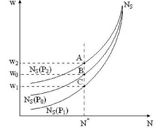 Фактическая ставка реальной заработной платы будет зависеть от уровня цен. При этом нужно отметить, что объем спроса на труд останется на неизменном уровне N0, соответствующем эффективному спросу, если уровень цен понизит фактическую ставку реальной заработной платы до значения \?0/Рlt;’\у0. В случае, когда \?0/Рgt;’\у0, занятость сократится до уровня, меньшего N0, произведенный продукт не позволит удовлетворить эффективный спрос и на товарном рынке образуется дефицит.