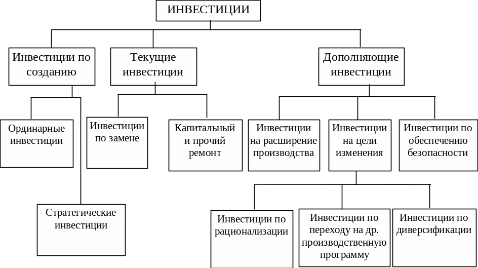 Представленная здесь классификация характеризуют существование инвестиций в многообразных формах проявления. Каждый вид инвестиций представляет собой проявление приведенных признаков. К различающимся по главным классификационным критериям видам инвестиций необходимо применять дифференцированные подходы в процессе инвестиционного планирования и расчета инвестиций.