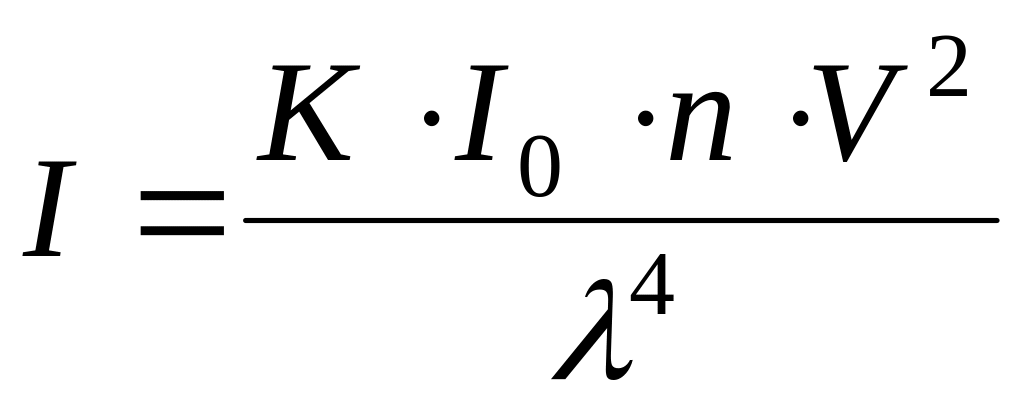 де І – інтенсивність розсіяного світла; І0 – інтенсивність падаючого світла; К – коефіцієнт, який залежить від співвідношення показників заломлення дисперсної фази і дисперсійного середовища; V – об'єм часточки; n – концентрація часточок у золі; – довжина хвилі падаючого світла.