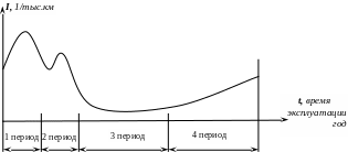 Для выявления элементов, лимитирующих надежность трубопроводной системы Республики Беларусь, проанализируем статистику аварий по данным журналов регистрации аварий и инцидентов на примере предприятий трубопроводного транспорта нефти и нефтепродуктов (рисунок 1.6). Распределение интенсивности возникновения аварий на линейной части магистральных трубопроводов в Республике Беларусь в целом совпадает с классическим графиком, используемым при анализе надежности и представленным на рисунке 1.7. [130 с.12]. На первом и втором этапе эксплуатации происходит «приработка» трубопровода. Отказы в эти периоды вызваны в основном низким качеством выполнения строительно-монтажных работ. После устранения крупных дефектов интенсивность отказов снижается и остается практически постоянной (3 период). Затем снова происходит монотонный рост интенсивности отказов, что связано со старением трубопровода (4 период). Отклонения в виде всплесков аварийности вызваны тем, что система магистральных нефтепроводов вводилась поэтапно и в периоды снижения аварийности в целом по системе совпадали с пиковыми значениями количества аварий для вновь построенных магистральных трубопроводов. При этом удельное количество аварий на единицу длины магистрального трубопровода в Республике Беларусь и сопредельных странах практически одинаково.