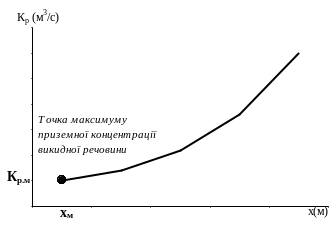 Опис зміни коефіцієнту розбавлення Кр. з відстанню х(м) в напрямку вітру має вигляд безперервної кривої з мінімумом, який відповідає точці максимуму приземної концентрації, тобто точці, де відбувається максимальне надходження домішок в нижній шар атмосфери внаслідок вертикальної дифузії і вітрового переносу (рис. 4.1.2.).