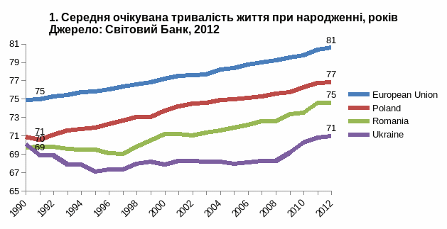 У 2012 р. середня тривалість життя при народженні в Україні складала 66,1 років для чоловіків і 76 років для жінок, що є низьким рівнем у порівнянні з середнім європейським показником (72,5 та 80 відповідно).