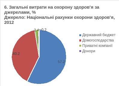 Приватні витрати на охорону здоров'я в Україні (46 млрд. грн. у 2012 році, 42,3% з загальних витрат на охорону здоров’я, та 3,2% ВВП) були одними з найвищих в ЄС та країнах Східної Європи, (цей показник був вищим тільки в Болгарії)4, але переважна більшість із цих приватних витрат були виплачені безпосередньо постачальникам послуг, без участі системи об'єднання коштів, що могло би забезпечити перехресне субсидування та спільний фінансовий захист. Конкретніше, домогосподарства оплатили 94% приватних витрат готівкою, в той час як частка добровільного медичного страхування та інших джерел були незначними(див. графік 7).
