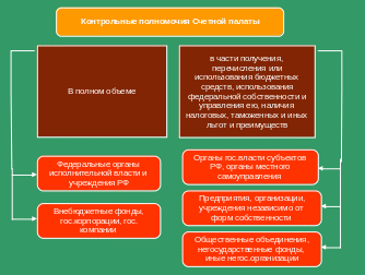 Контрольные функции Счетной палаты распространяются максимально широко. Потенциально объектом контроля может стать большинство учреждений и организаций, если они удовлетворяют следующим требованиям: