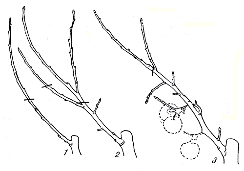 Рис. 65. Превращение с помощью обрезки сильной ростовой ветки в плодовую в течение трех последовательных лет (7, 2 и 3)