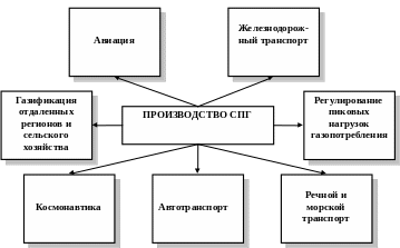 Россия обладает мощной разветвленной сетью газопроводов, что позволяет отбирать газ для сжижения практически в любом промышленно развитом районе, в том числе вблизи крупных аэропортов и морских терминалов. Другим возможным способом обеспечения потребителей СПГ является его сжижение вблизи месторождений и транспортировка в жидком виде. Кроме того, во всем мире сформирована достаточная научная и техническая база, позволяющая применять СПГ в качестве топлива для практически видов транспорта. На рисунке 56 представлены возможные области применения СПГ в различных отраслях народного хозяйства и транспорта, свидетельствующие об исключительной важности и перспективности этих технологий не только для газовой отрасли, но и для всей экономики в целом [30].