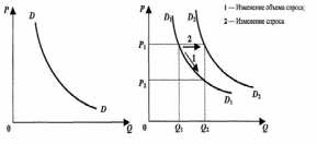 Изменение величины спроса наблюдается при изменении цены рассматриваемого товара и неизменности всех прочит параметров (вкусов, доходов, цен на другие товары). На графике подобное изменение отражается движением вдоль кривой спроса из точки (стрелка №1).