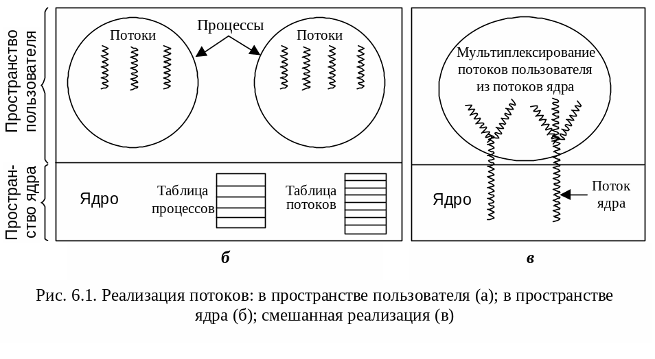 Пакет поддержки потоков целиком размещается в пространстве пользователя (рис. 6.1, а).