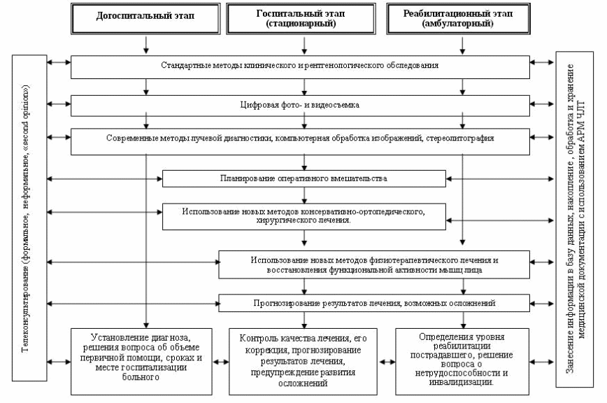 На догоспитальном этапе - проведение максимально возможного всестороннего обследования с использованием стандартных клинических и рентгенологических методов обследования, средств цифровой фото- и видеовизуализации, современных методов лучевой диагностики, компьютерной обработки изображений, изготовление стереолитографических моделей (по показаниям); проведение телеконсультаций у соответствующих специалистов (формальное и неформальное телеконсультирование, «second opinion») с целью установления диагноза, решения вопроса об объеме первичной помощи, сроках и месте госпитализации больного. На госпитальном этапе (стационарное лечение) – использование перечисленного выше арсенала технических средств с целью контроля качества лечения, при необходимости – его коррекции; использование новых методов консервативно-ортопедического, хирургического и физиотерапевтического лечения; прогнозирование результатов лечения и возможности развития осложнений; контроль уровня анатомической и функциональной реабилитации. На этапе реабилитации (амбулаторный этап) - использование стандартных клинических и рентгенологических методов обследования, средств цифровой фото- и видеовизуализации, современных методов лучевой диагностики и компьютерной обработки изображений, методов функциональной диагностики, телеконсультирования с целью определения степени восстановления анатомической формы и целостности костей лицевого скелета, уровня функциональной реабилитации, решения вопроса о сроках проведения очных консультаций у специалистов клиники, определение уровня реабилитации пострадавшего, решение вопроса о нетрудоспособности и инвалидизации, использование новых методов физиотерапевтического лечения и восстановления функциональной активности мышц лица. На всех этапах производится сбор, накопление, обработка и хранение медицинской документации с использованием АРМ ЧЛТ.