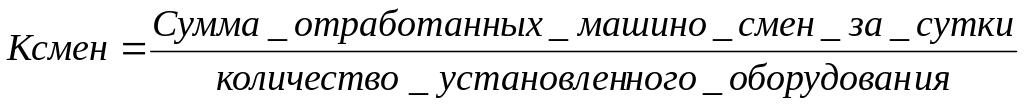 К-т сменности работы оборудования рассчитывается как отношение суммы отработанных машино-смен в сутках ко всему количеству установленного оборудования (включая резервное и находящееся в плановом ремонте)