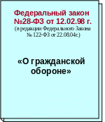 Основным документом, определяющим общий порядок организации и ведения ГО, ее задачи и структуру, является Федеральный закон "О гражданской обороне" № 28-ФЗ, принятый 12 февраля 1998 года ( в редакции Федерального Закона № 122-ФЗ от 22.08.04г.).