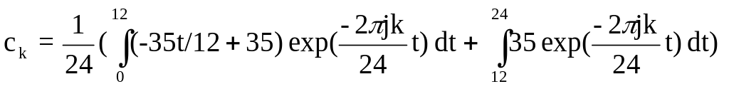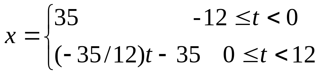 Виходячи із заданого графіка, сигнал описується фінітною функцією, тривалістю 24с. Перші 12с. сигнал має сталу амплітуду 35 од. Наступні 12с. – амплітуда змінюється лінійно від 35 до 0. Таким чином, маємо кускову функцію, що описує заданий сигнал: