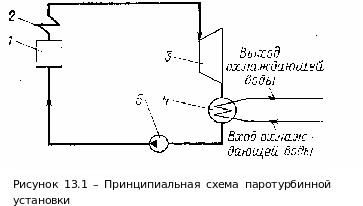 Принципиальная схема паротурбинной установки показана на рисунке 13.1. Её работа осуществляется следующим образом.