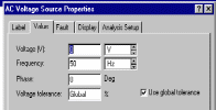 У нашому випадку, необхідно вибрати закладку «Value» (величина) і змінити параметри «Voltage» (діюче значення напруги), наприклад, 8В; Frequency (циклічна частота) - 50Гц; Phase (початкова фаза) - 0;