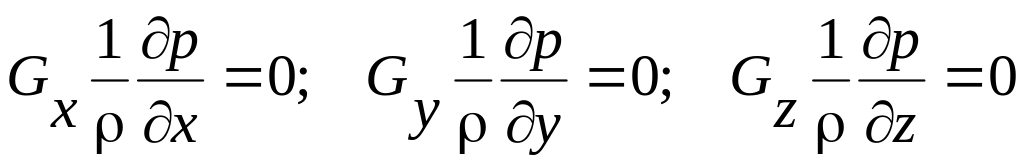 Учитывая 2-е свойство гидростатического давления, точно так же можно получить уравнения для проекций равнодействующей поверхностных и массовых сил на оси y и z: