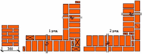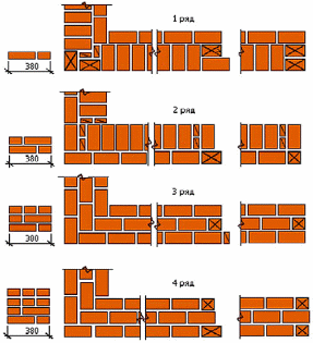 При строительстве стен в 1,5 кирпича (380 мм) схема кладки углов будет несколько более сложная.
