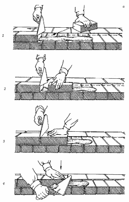 Способом вприжим (рис. 2) выкладывают стены из кирпича на жестком растворе с полным заполнением и расшивкой швов. Этим способом укладывают как ложковые, так и тычковые версты. При этом раствор расстилают с отступом от лица стены на 10–15 мм. Разравнивают раствор тыльной стороной кельмы, перемещая ее от уложенного кирпича и устраивая растворную постель одновременно для 3 ложковых или 5 тычковых кирпичей. Кладку вприжим выполняют в следующем порядке. Держа в правой руке кельму, разравнивают ею растворную постель, затем ребром кельмы подгребают часть раствора и прижимают его к вертикальной грани ранее уложенного кирпича, а левой рукой доносят новый кирпич к месту укладки. После этого опускают кирпич на подготовленную постель и, двигая его левой рукой к ранее уложенному кирпичу, прижимают к полотну кельмы. Движением вверх правой руки вынимают кельму, а кирпичом, придвигаемым левой рукой, зажимают раствор между вертикальными гранями укладываемого и ранее уложенного кирпича. Нажимом руки осаживают уложенный кирпич на растворной постели. Избыток раствора, выжатый из шва на лицо кладки, подрезают кельмой за 1 прием после укладки тычками каждых 3–5 кирпичей или после укладки ложками двух кирпичей.