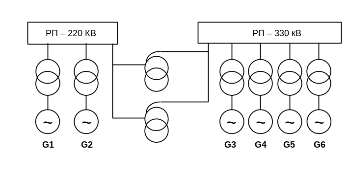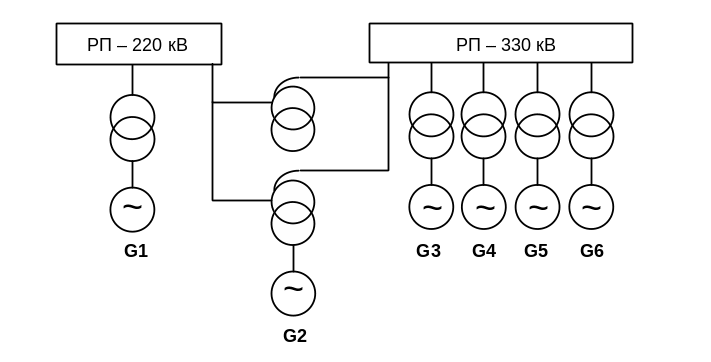 У першому варіанті ( рисунок 2.1) до РП 330 кВ приєднано чотири блоки, схема РП-3/2 вимикача на одне приєднання. На середню напругу 220 кВ – схема РП дві робочі системи шин з обхідною системою шин. До РП 220 кВ приєднано два блоки.