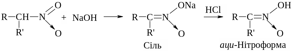 Завдяки цьому первинні і вторинні нітросполуки розчиняються в лугах з утворенням солей. Треба мати на увазі, що це солі не власне нітросполук, а ізомерних їм ізонітросполук, так званих аци-нітроформ. Аци-нітроформи виявляють сильно виражені кислотні властивості: