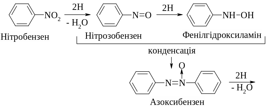 4. Відновлення нітросполук зумовлює утворення первинних амінів. Особливе значення має відновлення ароматичних нітросполук, під час якого синтезуються у промисловому масштабі важливі нітрогеновмісні ароматичні сполуки. Залежно від типу відновника і відповідних умов реакції можна добути різні продукти відновлення. У нейтральному або кислому середовищі реакція відбувається за схемою: