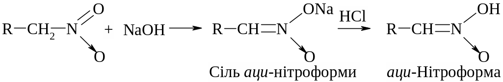 Аци-нітроформа утворена при підкисленні розчину, її солі швидко ізомеризується в нітроформу. Таким чином, аліфатичні нітросполуки є псевдокислотами, оскільки вони самі нейтральні, не мають електропровідності, однак утворюють солі лужних металів.
