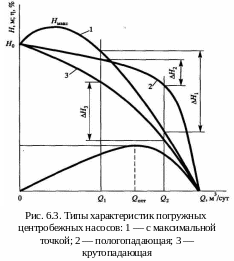 По целому ряду причин наихудшими для эксплуатации скважин являются насосы с характеристикой с максимальной точкой, а наилучшими — насосы с пологопадающей характеристикой. Как видно из рис. 6.3, потеря напора в рациональной области подач для насосов с характеристикой с максимальной точкой составляет ∆Н1; для насосов с пологопадающей характеристикой — ∆Н2; для насосов с крутопадающей характеристикой — ∆Н3; при этом ∆Н1 > ∆Н3 > ∆Н2. Таким образом, наименьшая потеря напора в рациональной области работы насоса характерна для насосов с пологопадающей характеристикой, что является их существенным эксплуатационным преимуществом.