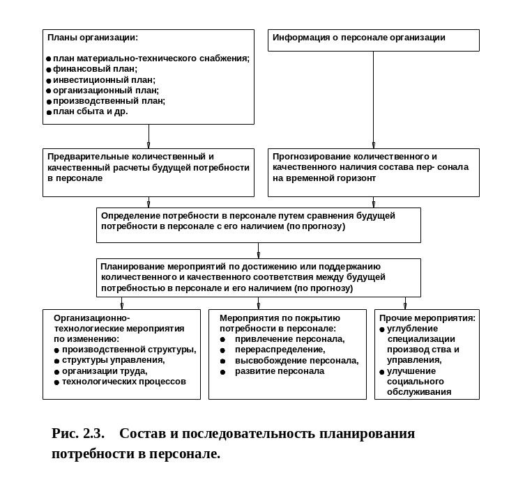 Кадровое планирование реализуется в целом комплексе взаимосвязанных мероприятий, объединенных в оперативные планы работы с персоналом: - планирование, потребности в персонале (рис.23) является начальной стадией процесса кадрового планирования, базируется на данных об имеющихся и создаваемых вновь рабочих местах, плане проведения организационно-технических мероприятий, штатном расписании и плане замещения вакантных должностей;