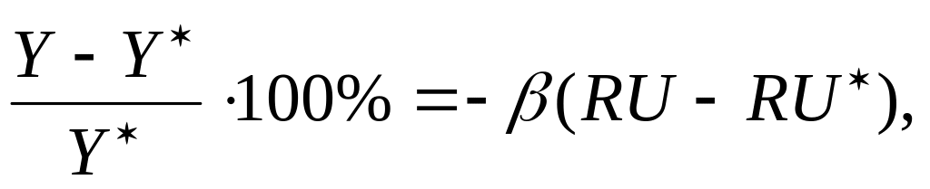 А формула, отражающая зависимость между отклонением фактического ВНП от потенциального и уровнем циклической безработицы (формула закона Оукена) имеет вид: