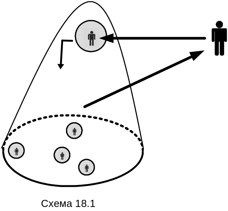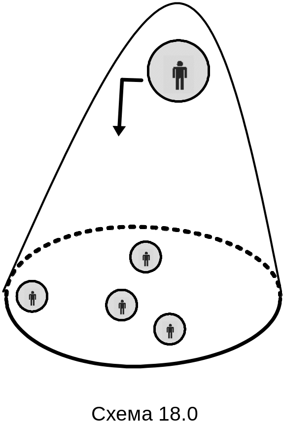 Принцип: То, что среди врагов есть один главный, показывается тем, что Главный враг как бы включает в свою позицию остальных врагов. Для этого используем базовую схему, похожую на схему-принцип стратагемы 16 «То, что хочешь поймать, сперва отпусти», но здесь Главный враг занимает «управленческий фокус» над несколькими действующими субъектами.