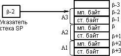 При записи в стек, например, при выполнении команды CALL ADR, число А3 записывается в две свободные ячейки ОЗУ, находящиеся выше указателя, при этом указатель передвигается на новую вершину – на адрес младшего байта только что записанного числа. Новое состояние стека после записи числа А3 изображено на рис.1.5.